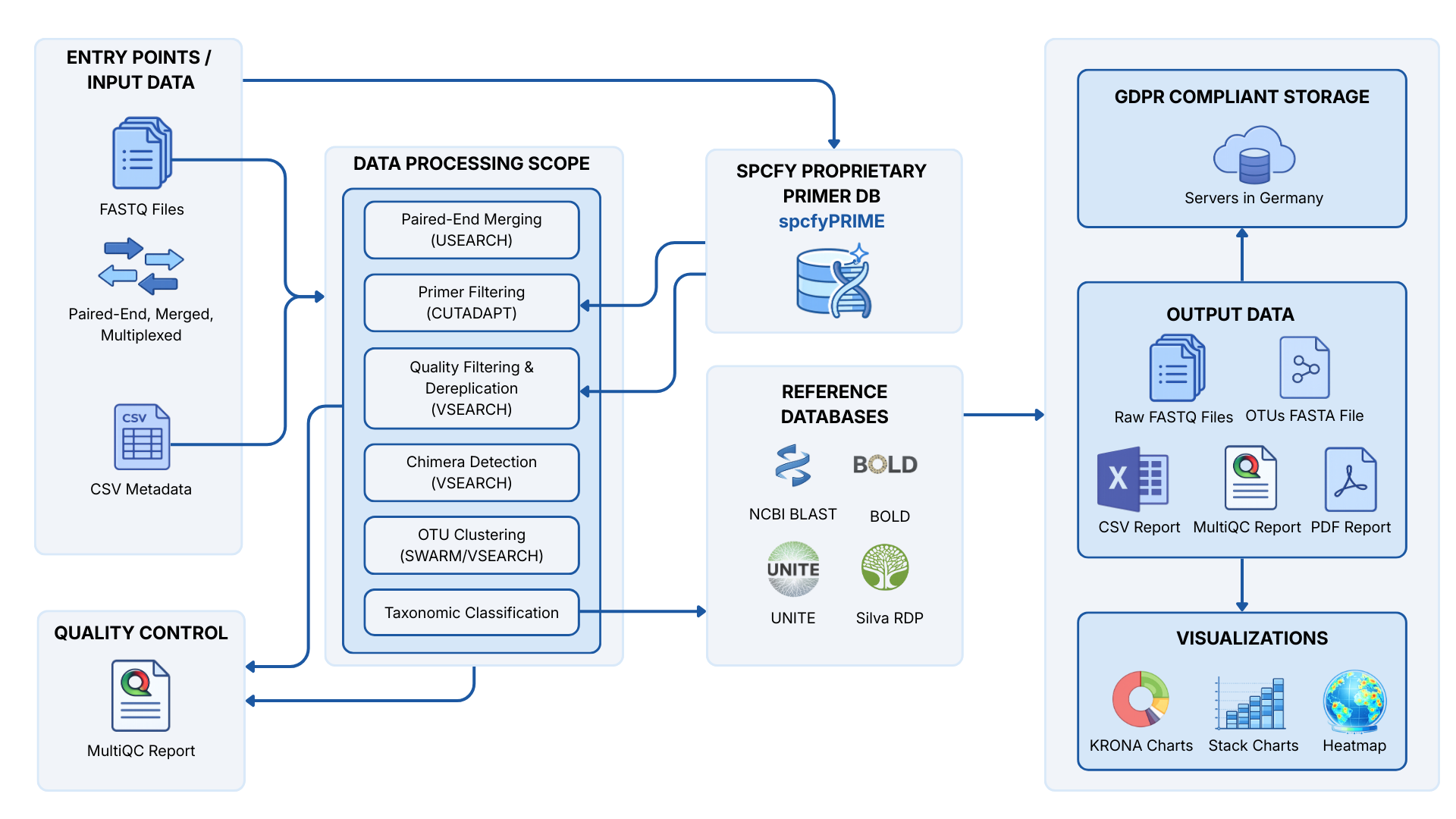 spcfy is designed around your Metabarcoding workflow: Uploading FASTQ files, structuring metadata, processing OTUs, assigning taxonomy, and interpreting results across projects. By integrating all relevant steps of DNA Metabarcoding analysis, we want to help bioinformaticians and laboratories standardize repetitive tasks, thereby enabling them to refocus on the scientific part of their work.